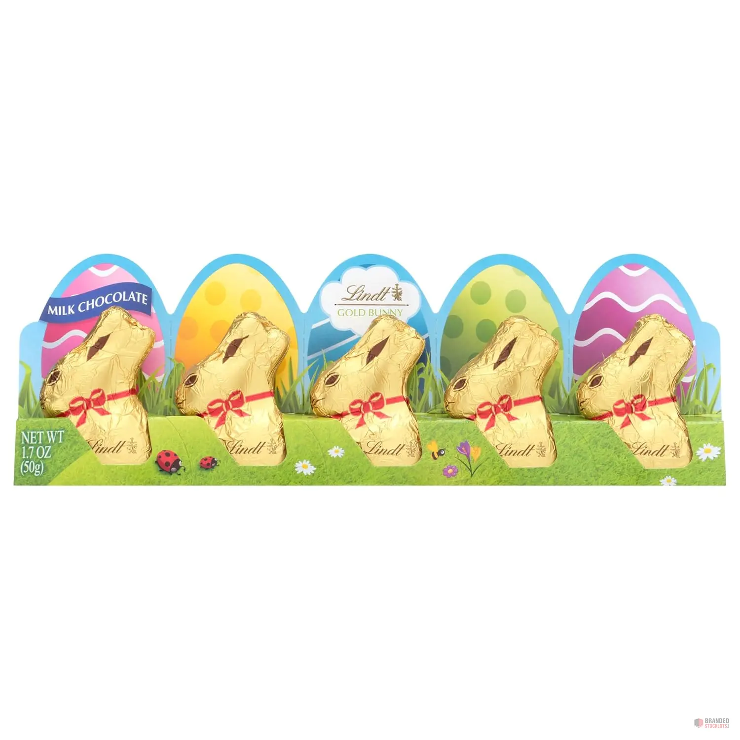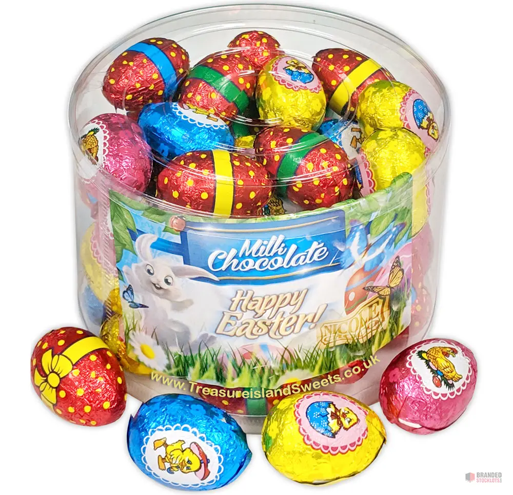 Includes small eggs and gold bunny figures, perfect for seasonal promotions and gift assortments.