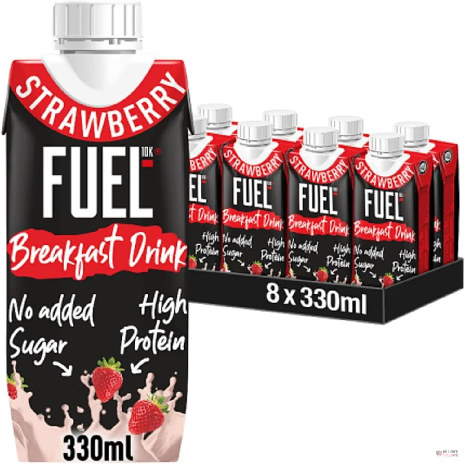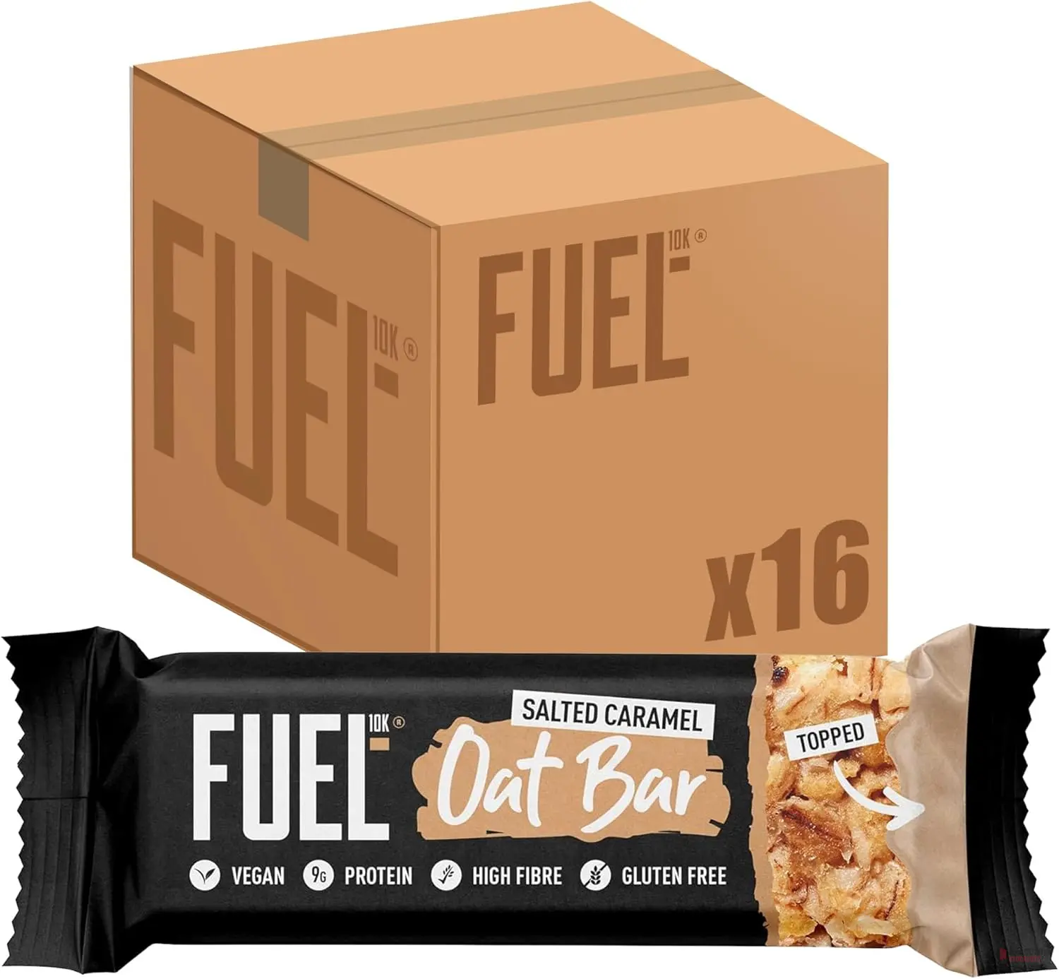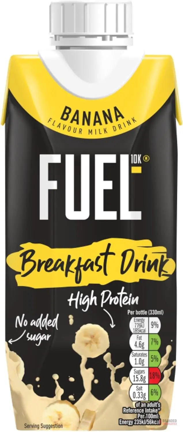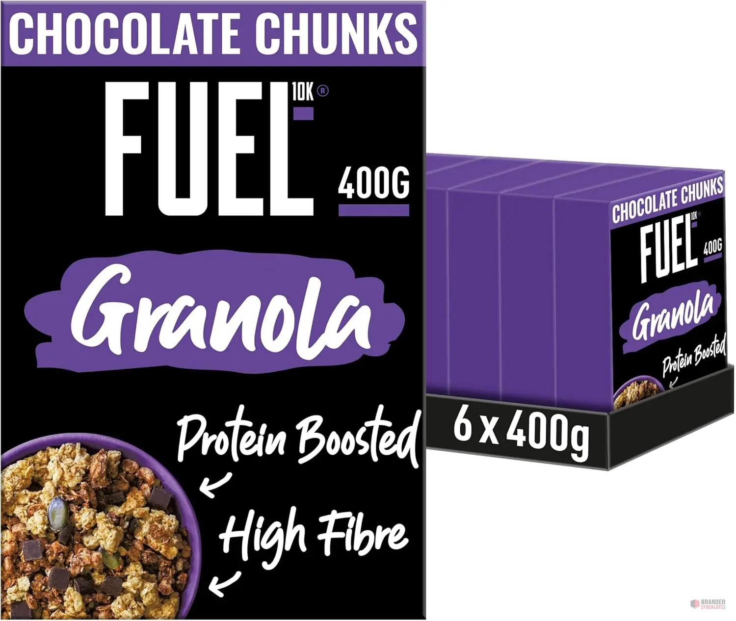 Assorted Fuel10K breakfast products including drinks, granola, porridge pots, and snack bars.
