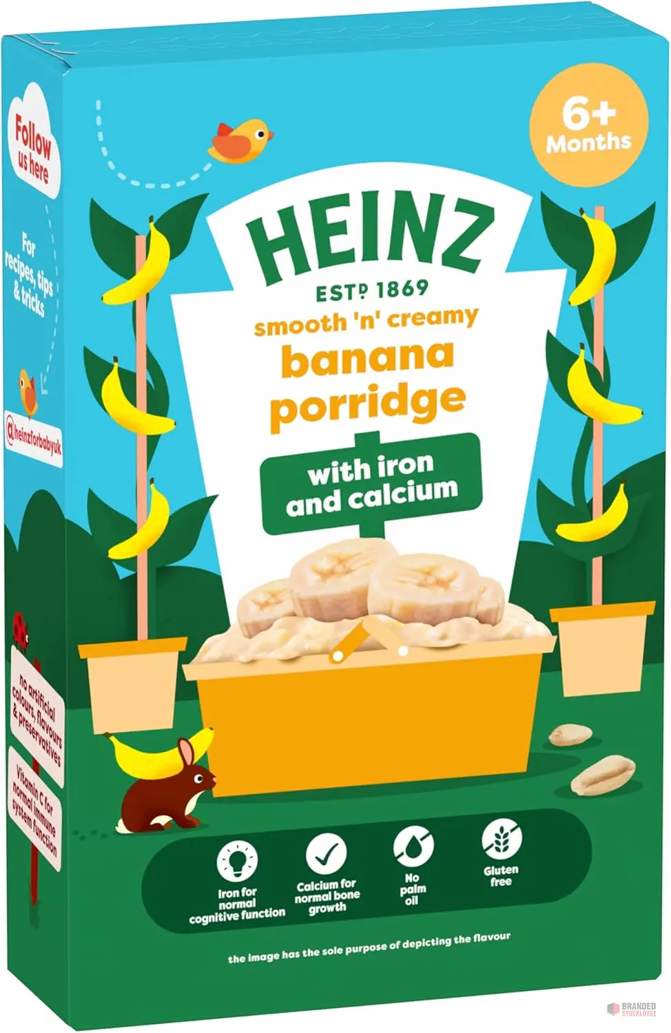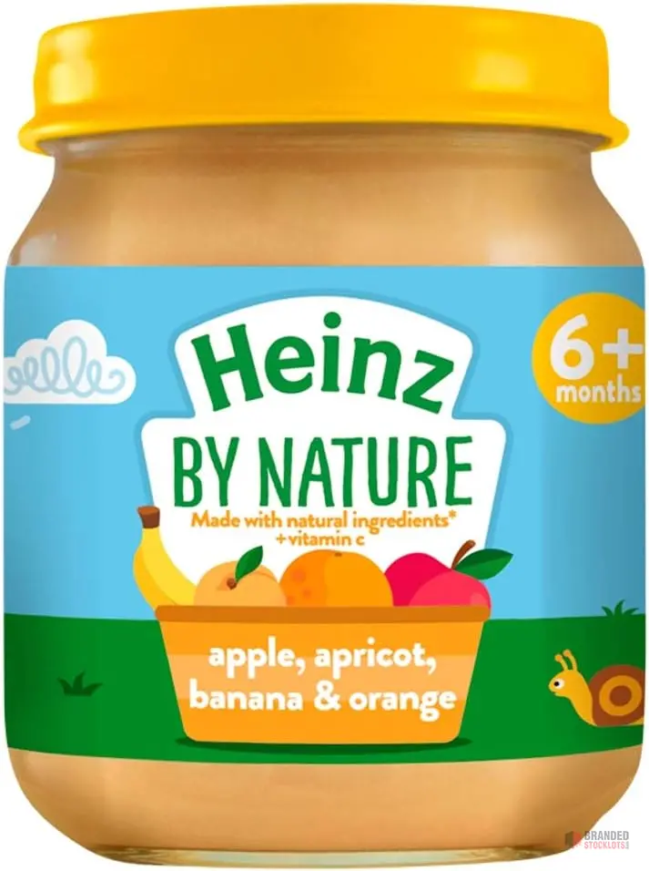 Assorted Heinz baby food range with fruit and cereal flavours.